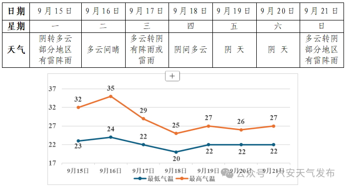今明两天气温短暂回升,明天最高气温升至35℃左右;受冷空气影响,后天起气温逐渐下降,18日最高气温降至25℃;周后期气温变化不大,最高气温25~27℃,最低气温21~23℃。