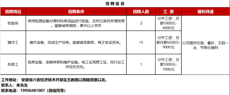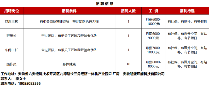 (9月18日) 更多企业招聘信息请登录六安市公共招聘网安徽朗盛环能科技有限公司
