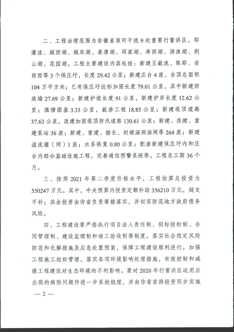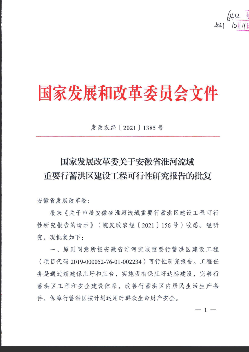 国家发展改革委关于安徽省淮河流域重要行蓄洪区建设工程可行性研究报告的批复