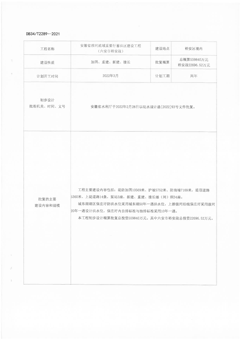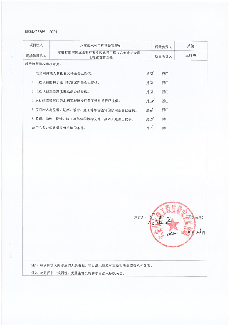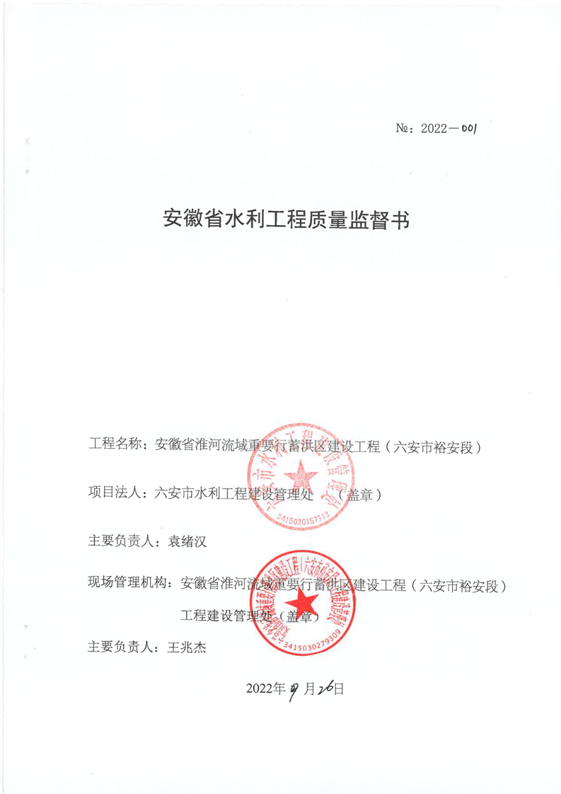 安徽省淮河流域重要行蓄洪区建设工程(六安市裕安段)质量监督书