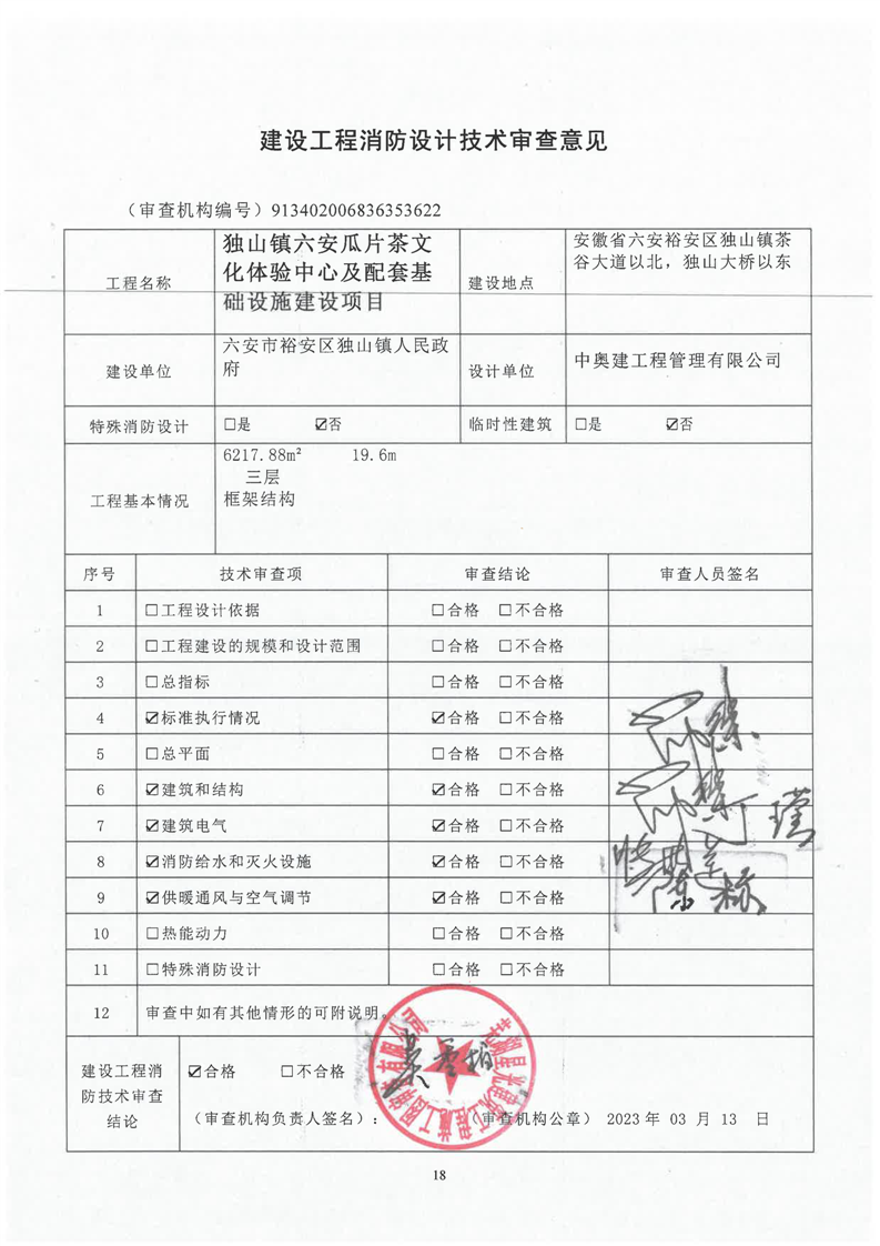 独山镇六安瓜片茶文化体验中心及配套基础设施项目消防设计技术审查意见书