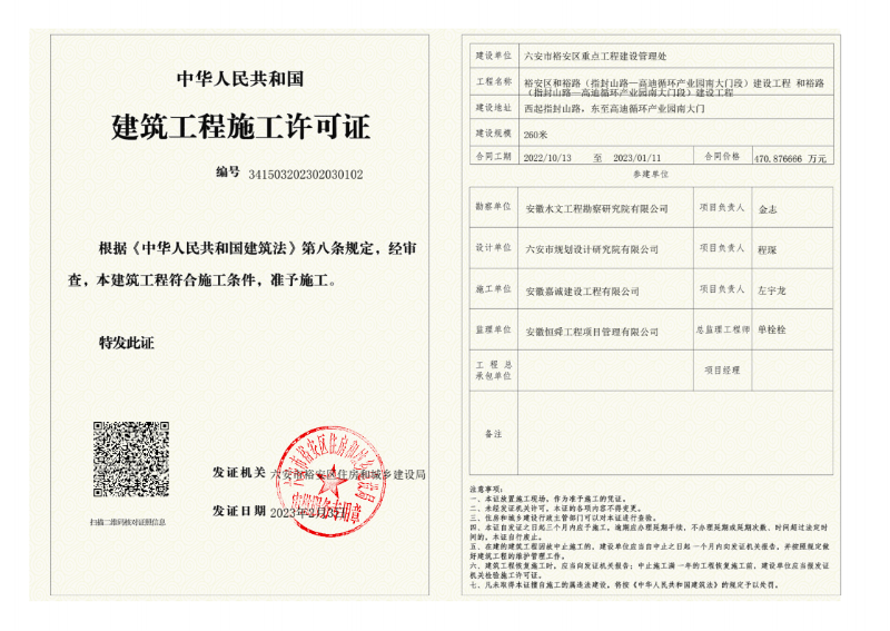 和裕路(指封山路-高迪循环产业园南大门段)项目建筑工程施工许可证