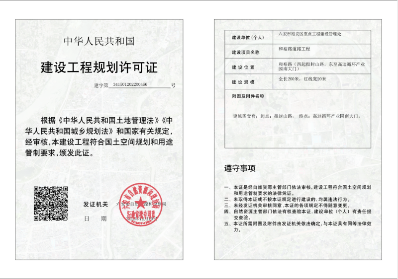 和裕路(指封山路-高迪循环产业园南大门段)建设工程规划许可证