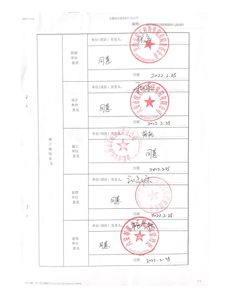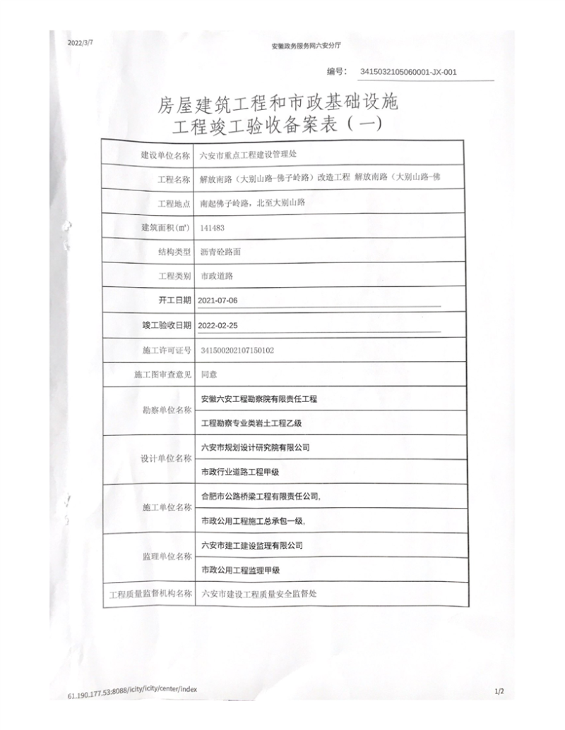 解放南路(大别山路-佛子岭路)改造工程竣工验收备案表