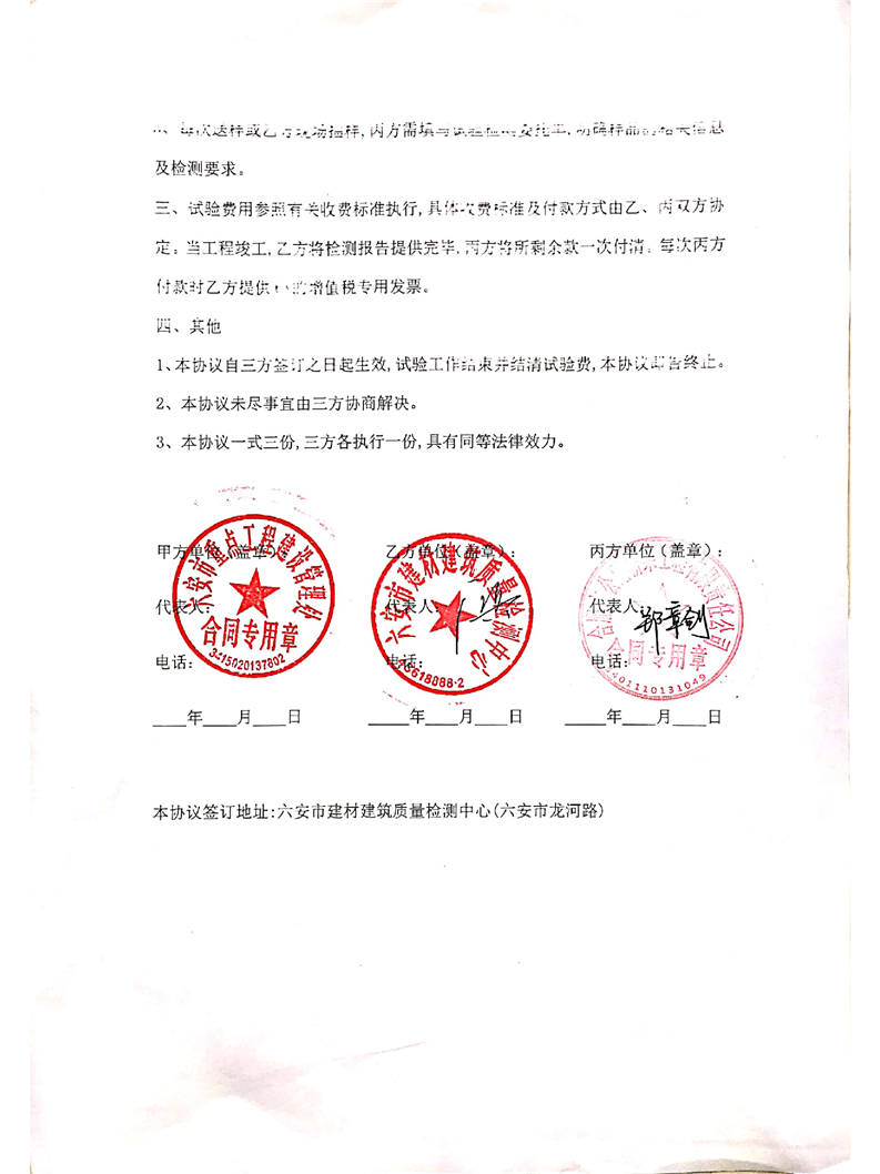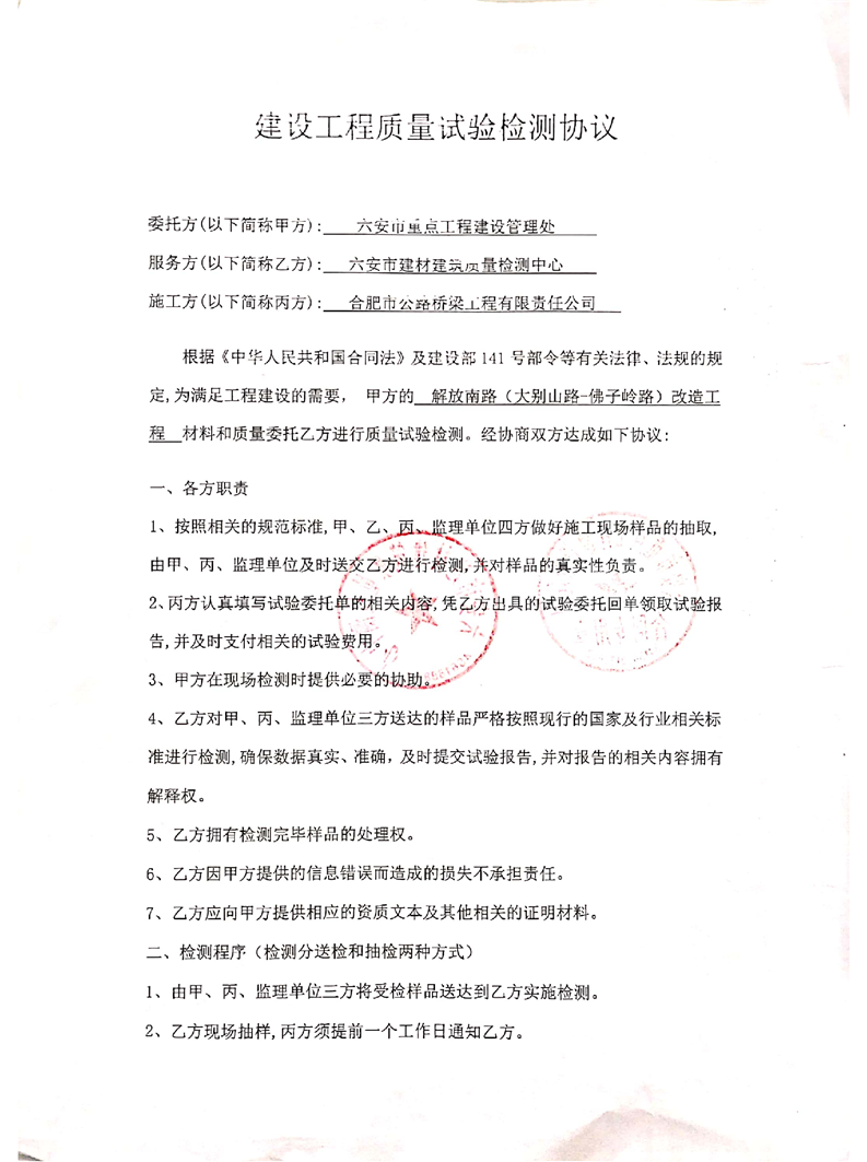 解放南路(大别山路-佛子岭路)改造工程质量试验检验协议