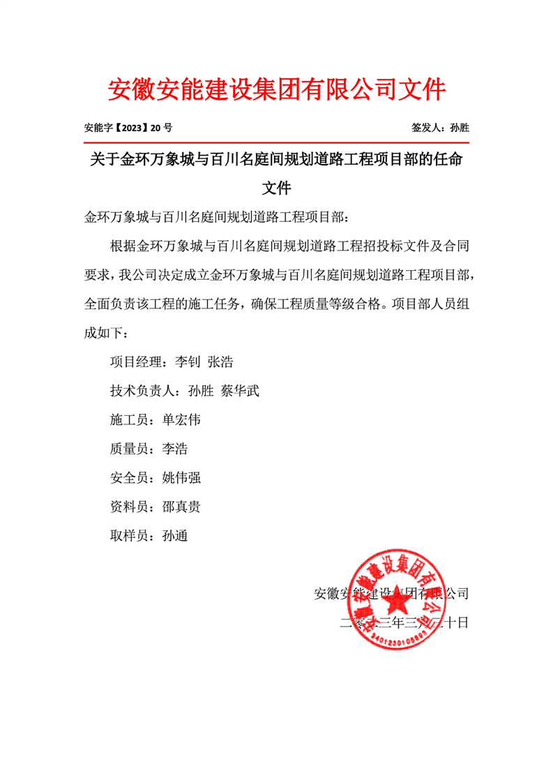 关于金环万象城与百川名廷间规划道路工程项目部的任命文件