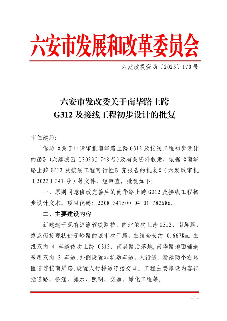 六安市发改委关于南华路上跨G312及接线工程初步设计的批复