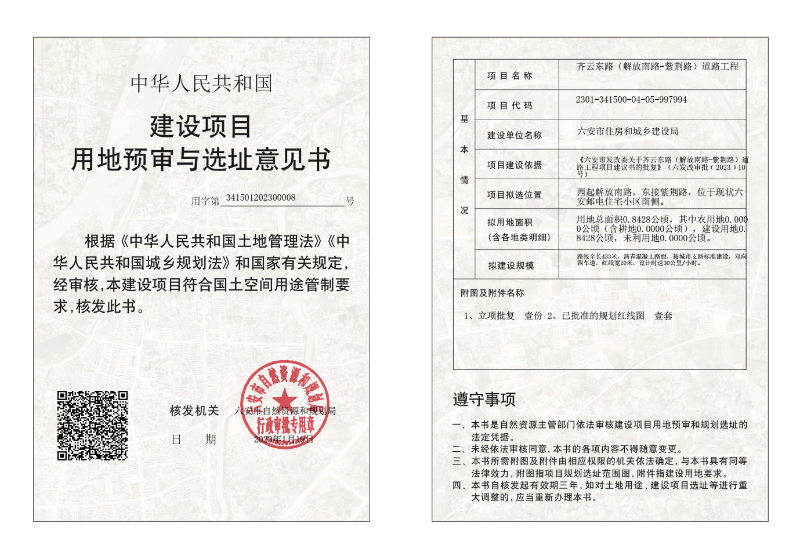 齐云东路(解放南路—紫荆路)道路建设项目用地预审与选址意见书