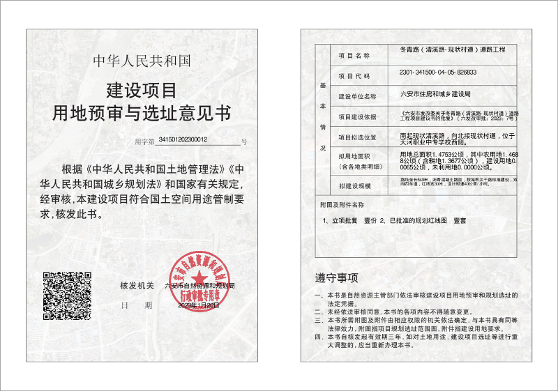 冬青路(清溪路-现状村道)道路工程用地预审与选址意见书