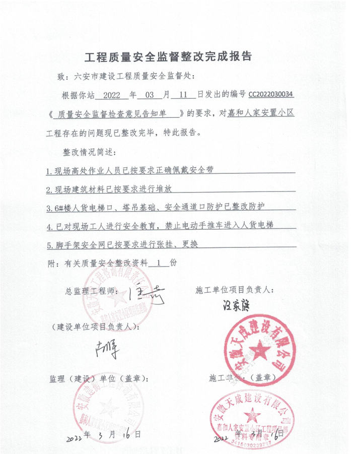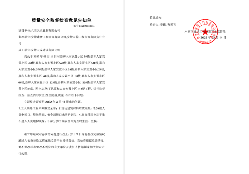裕安区嘉和人家安置小区项目质量监督安全检查信息