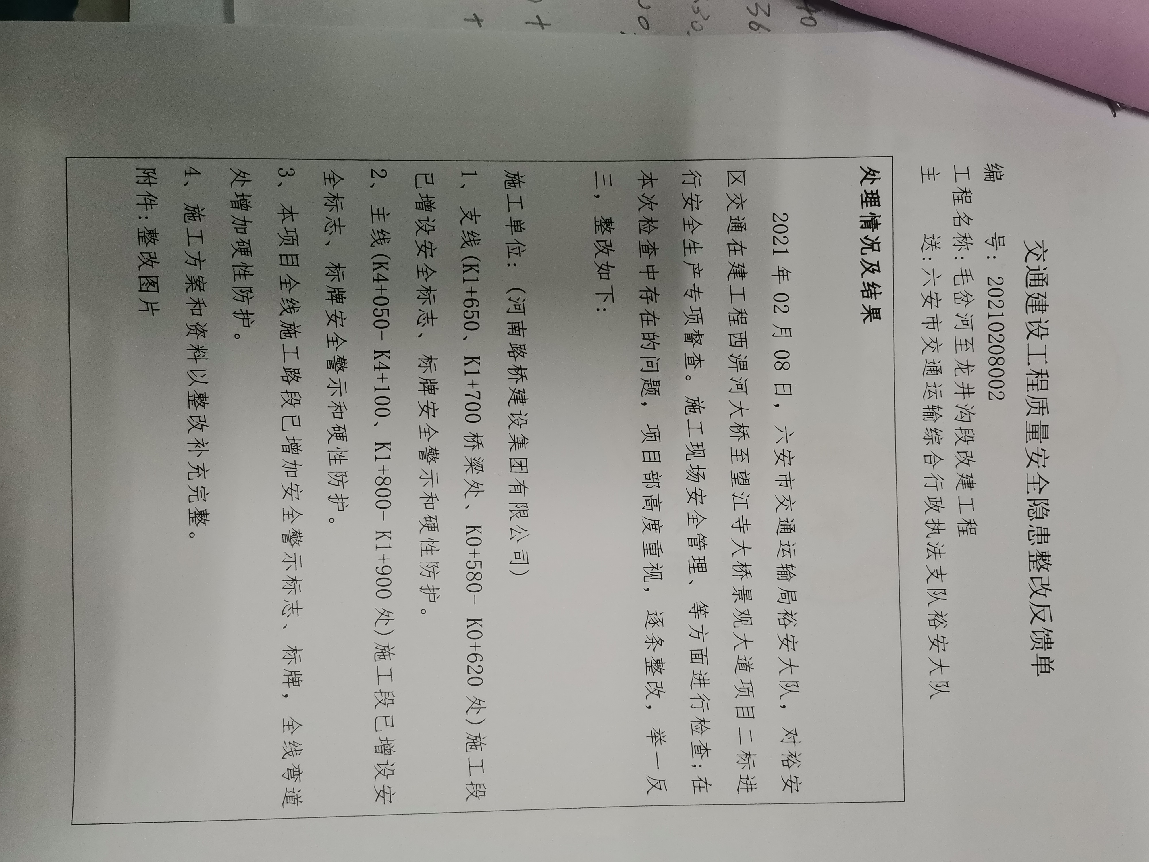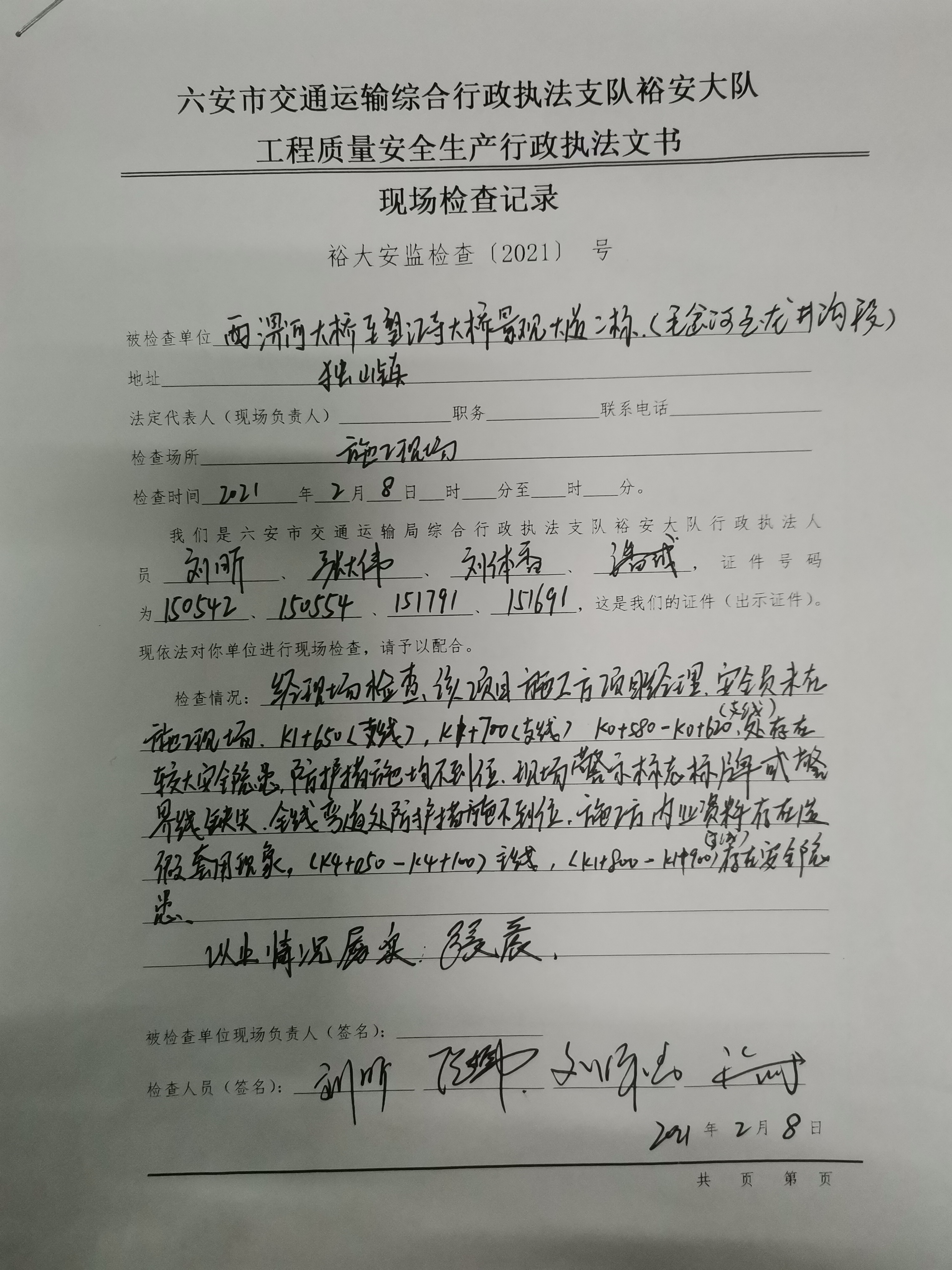 西淠河大桥至望江寺大桥景观大道二标(毛岔河至龙井沟段)安全生产监督检查