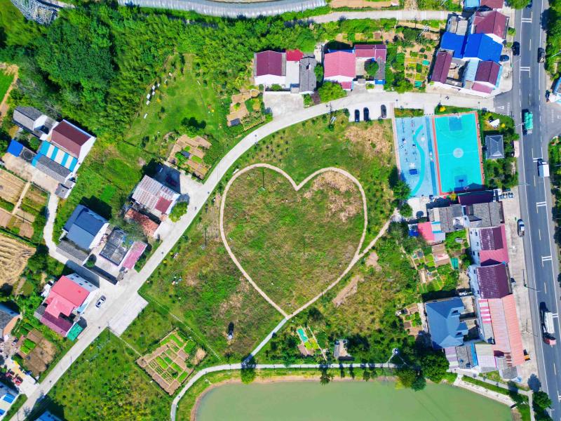 丁集镇华祖村像大自然私藏的诗意画框:心形草甸漾着温柔心事,蓝得透亮的球场跃动鲜活气息,彩瓦屋舍如宝石散落在绿野间,碧水绕岸、树影轻摇,每一寸都晕染着田园的灵秀与生机,引人心向神往。(陈睿)