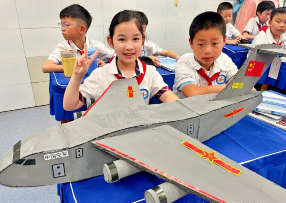 创意实践让思政教育从“课堂”走向“指尖”,让家国情怀在动手创作中落地生根。六安市城北小学依托“全国中小学国防教育示范学校”建设优势,组织少先队员开展国防主题手工作品创作活动。学生们充分发挥想象力与创造力,以纸箱、塑料瓶、彩纸等日常材料为原料,经过裁剪、粘贴、上色等细致工序,精心打造出歼-20战斗机、坦克、军舰、航母、火箭等形态逼真的模型。这些充满童趣与创意的作品,将普通教室装点成一座“微型国防教育展览馆”,学生在动手过程中不仅直观感受了国防科技的魅力,更在潜移默化中强化了国防意识,让“热爱祖国、守护和平”的种子在心底悄然发芽。