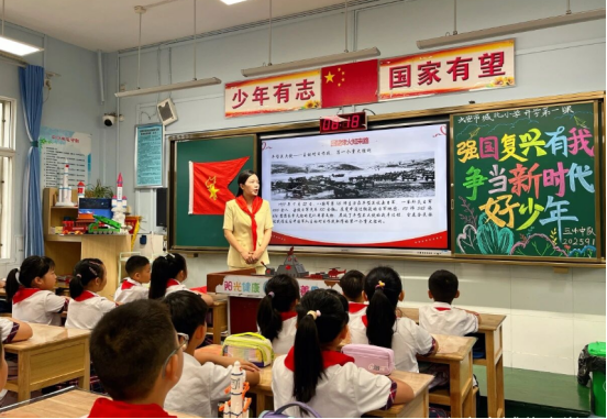 “我是中国人,我骄傲!”开学首日的思政课堂上,这句铿锵有力的话语成为师生共同的心声。各校紧扣“赓续红色血脉”核心主题,精心设计教学内容。解放路小学以“赓续阅兵荣光,启航逐梦新程”为主线,分“铭记历史、时代变迁、阅兵启示、新程启航”四个板块,由辅导员深入讲解抗战历史的壮阔进程,细致阐释伟大抗战精神的深刻内涵,引导学生从阅兵仪式中感悟团结的力量、坚强的意志、和平的珍贵与爱国的热忱。江家店镇、狮子岗乡各学校联动暑期热门爱国主义影片《南京照相馆》《东极岛》,通过展示泛黄的历史老照片、还原影片背后鲜为人知的真实抗战故事,带领学生“穿越”烽火岁月,重温革命先辈为守护国家独立、捍卫民族尊严浴血奋战的英勇事迹。顺河镇各学校以“思政+本土+成长”打造开学第一课,依托绍虞广场讲红色故事厚植家国情怀,为新学期筑牢成长根基。在课堂互动环节中,学生们结合自身感悟踊跃发言,在沉浸式学习里深刻体会如今和平生活的来之不易,进一步坚定“强国复兴有我”的理想信念,学会将个人成长的小目标融入国家发展的大蓝图。