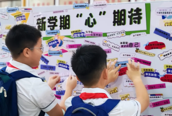 此外,河西小学等学校还注重将思政教育与学生心理健康成长相结合,通过设置“新学期.‘心’期待”心愿墙,鼓励学生将对未来的憧憬、对成长的期许写在色彩斑斓的便签上——“争取做更好的自己”“用努力追逐梦想”“以奋斗致敬英雄”,一张张便签宛如绽放的“心愿花”,既传递了积极向上的成长心态,也让思政教育更具温度与感染力。同时,各校通过精心布置教室、开展趣味互动等方式,营造出温馨且富有仪式感的开学氛围,让思政教育融入校园生活的每一个细节。