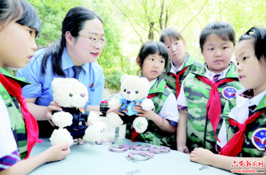 ←裕安区人民检察院未检干警在向“军娃”介绍警用装备。