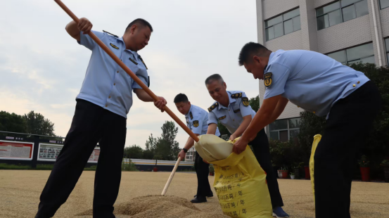 9月3日,在六安市裕安区新安镇新安交通所大院内,金灿灿的稻谷正平铺在水泥地上,执法人员刘柱正在帮助村民翻晒粮食。村民李大妈说道:“感谢新安交通执法所的工作人员,这下再也不用起早贪黑去路边晒粮了!”