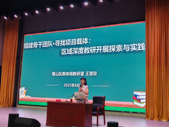 随后,合肥市蜀山区教研员王慧珍带来题为《组建骨干团队·寻找项目载体:区域深度教研开展探索与实践》的专题讲座。王慧珍教研员结合自身多年的教研经验,分享如何有效组建骨干教研团队,通过项目载体推动区域深度教研的开展。她介绍了具体的团队组建策略、项目管理方法以及教研成果的推广与应用,为参训教师提供一套可操作的区域教研实施方案。